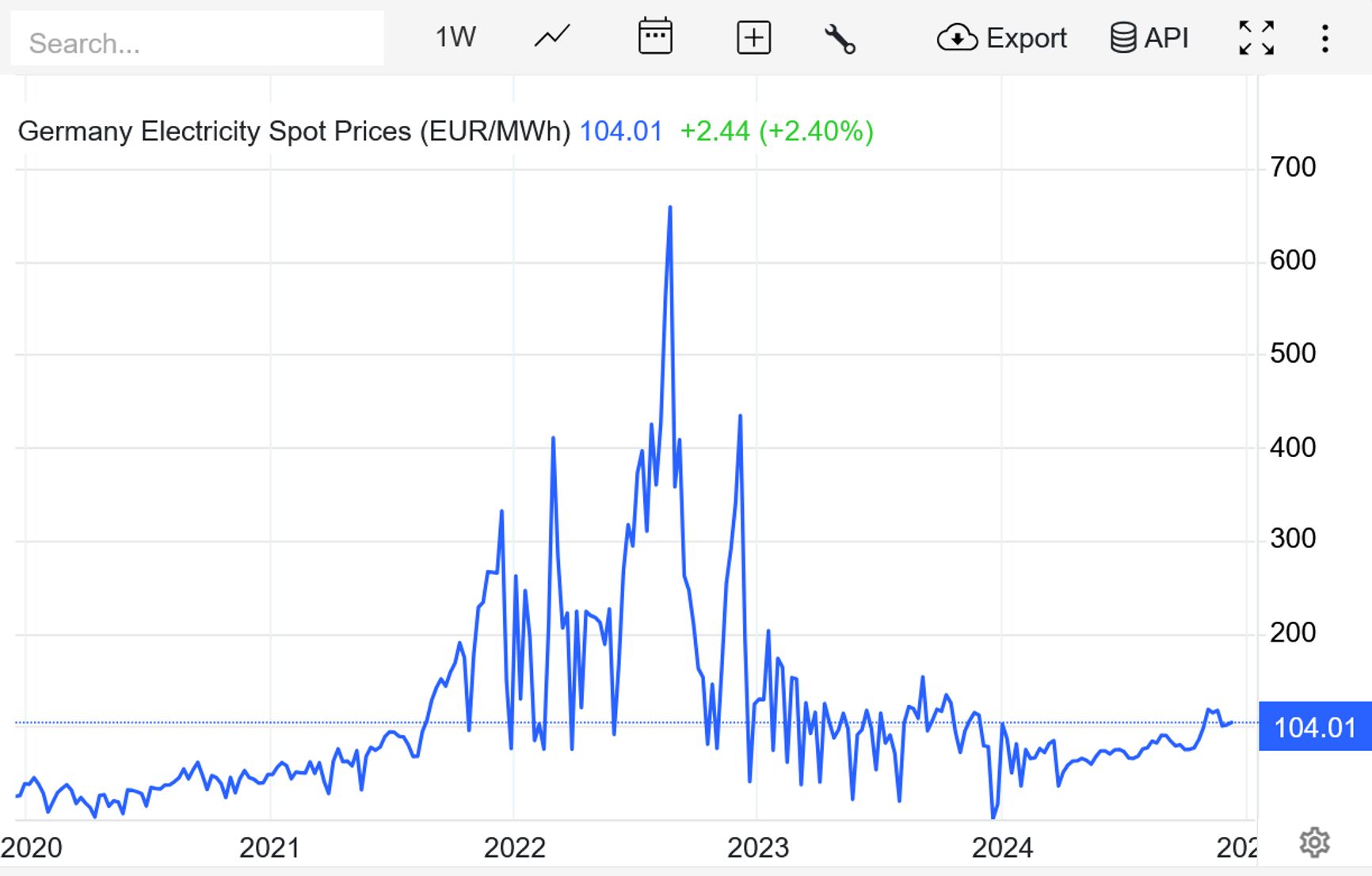 Но если взглянуть на тот же график за 5 лет, очевидно, насколько незначителен нынешний рост цен по сравнению с тем, что энергетический рынок Германии пережил в 2021–2022 годах. Сегодняшние цены примерно втрое ниже довоенного максимума 13 декабря 2021 года, когда Германия благополучно импортировала российский газ.