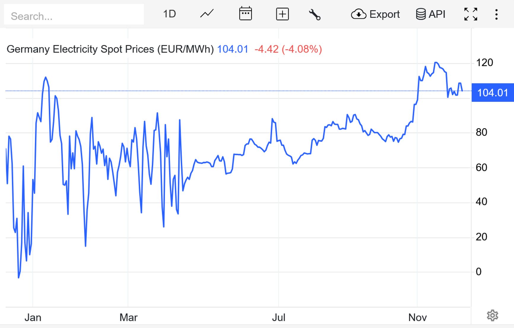 Как видно из инфографики Trading Economics, 11 декабря средняя спотовая цена за день была €104,01, и это существенно выше, чем год назад, когда в какие-то моменты цена падала даже до отрицательных значений.