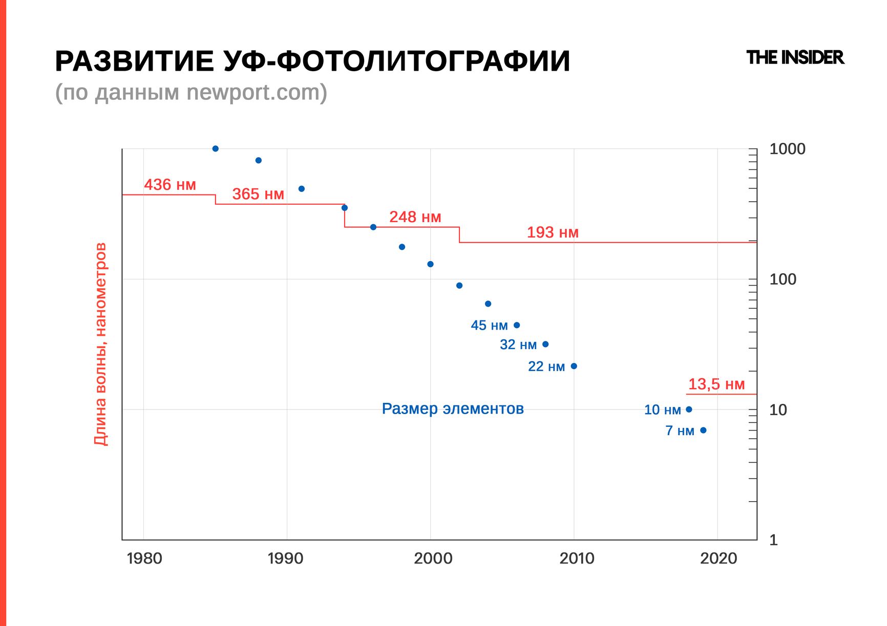 Россия пыталась производить свои микросхемы как по модели fabless, так и в рамках полного цикла. До недавнего времени Тайвань принимал российские заказы на изготовление процессоров Байкал и Эльбрус российских бесфабричных производителей. Однако TSMC с началом полномасштабной войны прекратил отгрузки в Россию. Можно ли производить микросхемы в самой России? Можно, но не любые. Степень современности технологии измеряется в длине волны, на которой работает установка. Чем короче длина волны, тем мельче размер транзистора на микросхеме.