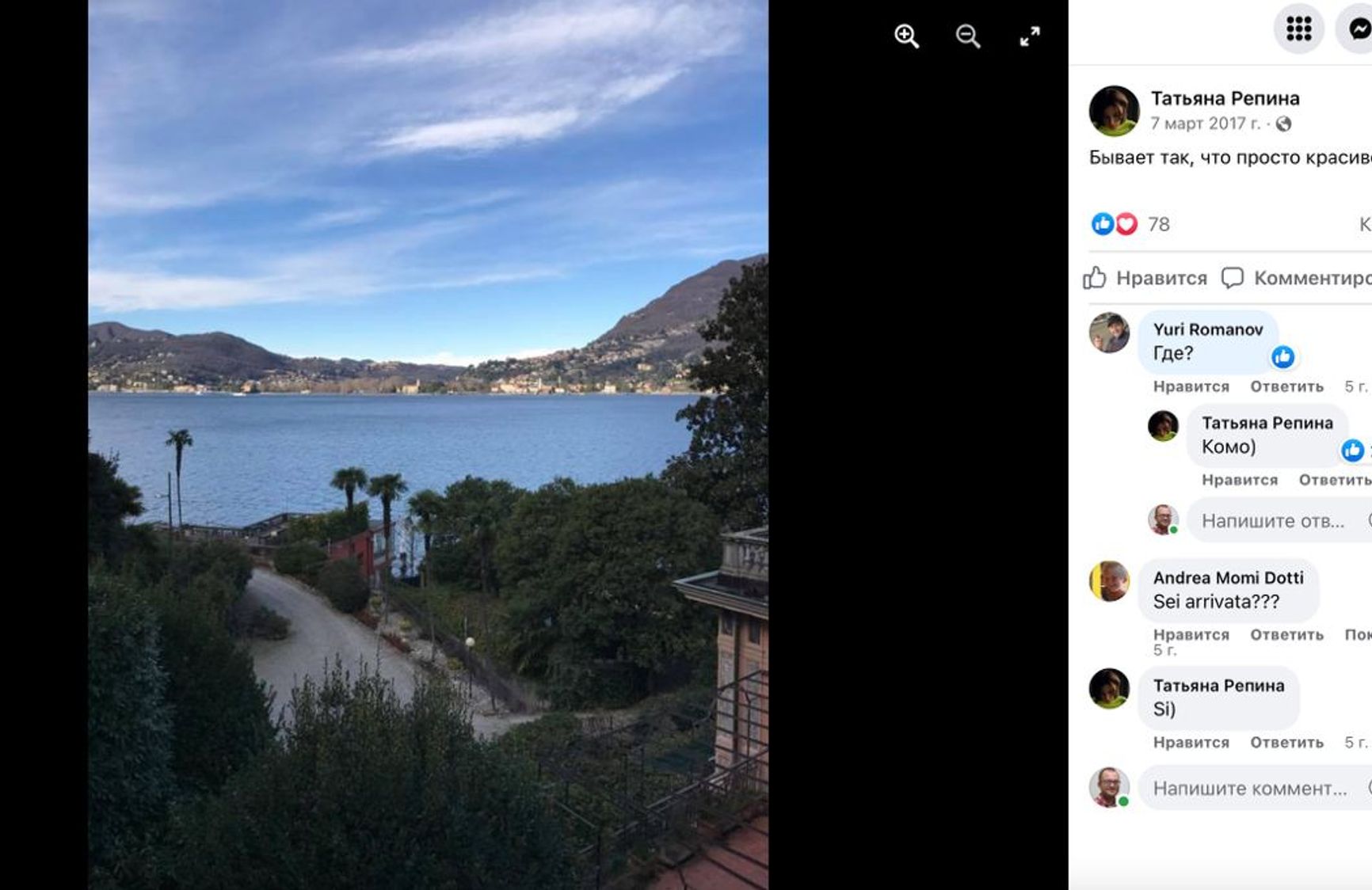 В своем Facebook Татьяна Ющенко (aka Репина) опубликовала фото с видом знаменитого озера Комо в Италии.