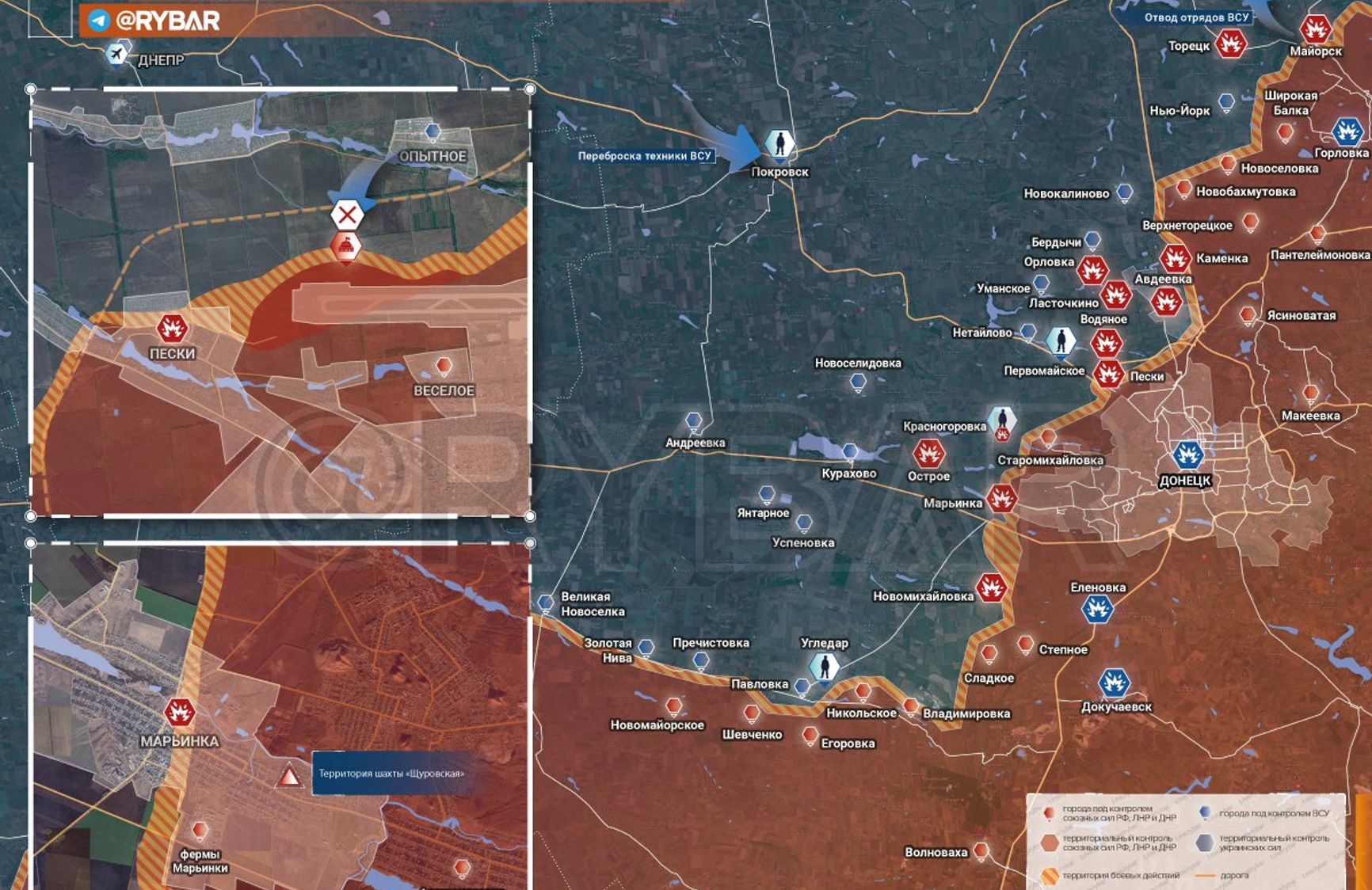 Украинское командование продолжает контрнаступление на населенные пункты в Донецкой области. Как сообщает пророссийский Telegram-канал «Рыбарь», в ночь на 14 сентября подразделения ВСУ могут начать штурм позиций на направлении Песок и Марьинки. Украинские артиллерия и РСЗО усилили обстрел позиций в данных населенных пунктах и на западных окраинах Донецка. На железнодорожную станцию в Покровске прибыл поезд с военной техникой и личным составом для наступления на Донецком направлении.