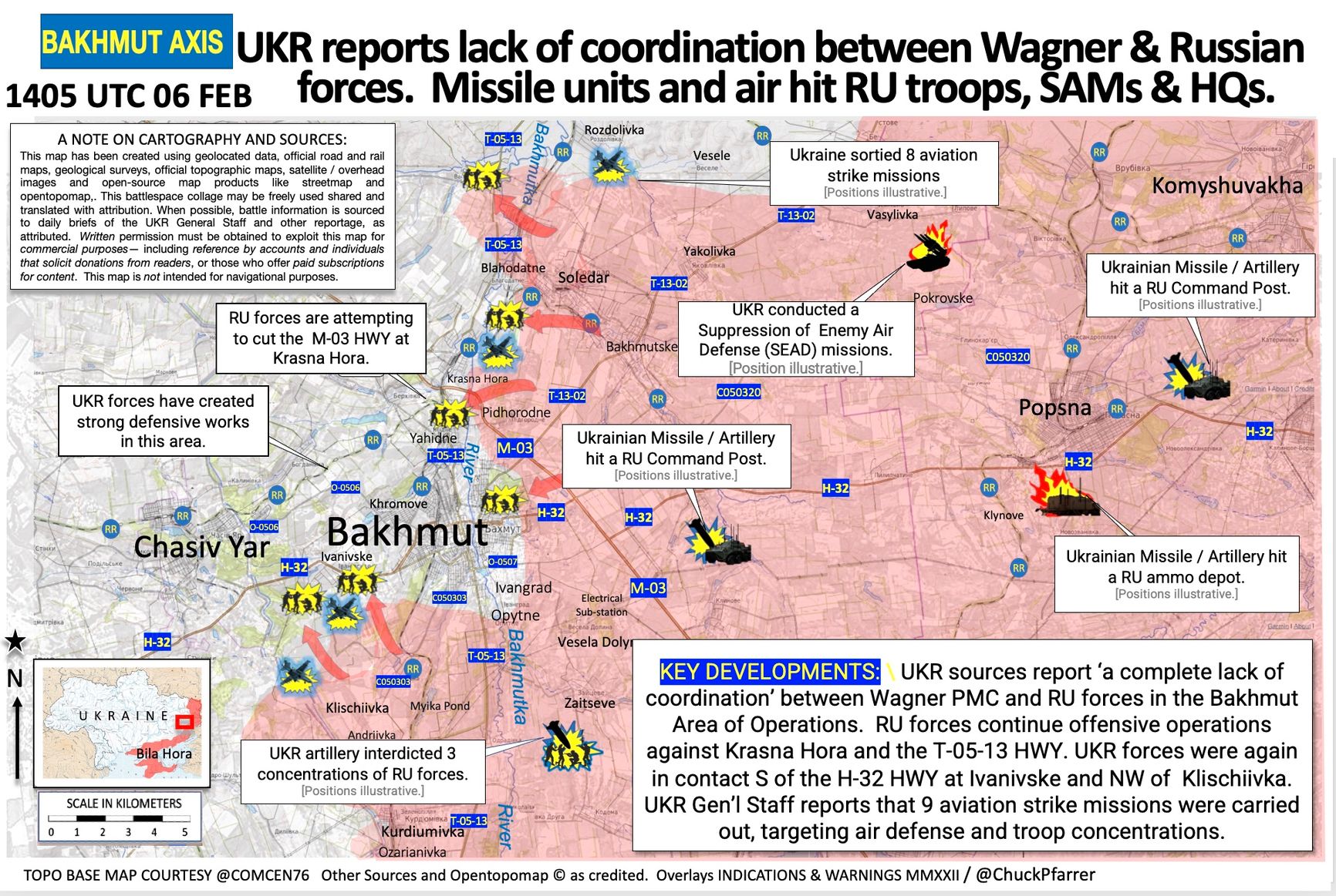 «M03 и H32 — две основные дороги в город [Бахмут] для украинских защитников — сейчас, предположительно, находятся под угрозой прямого огня после наступления России. <…> Военизированные формирования Вагнера, скорее всего, захватили второстепенную дорогу, соединяющую Бахмут с городом Северск. В то время как многочисленные альтернативные маршруты поставок через проселочные дороги остаются доступными для украинских сил, Бахмут становится всё более изолированным», — говорится в сводке британской разведки от 5 февраля.