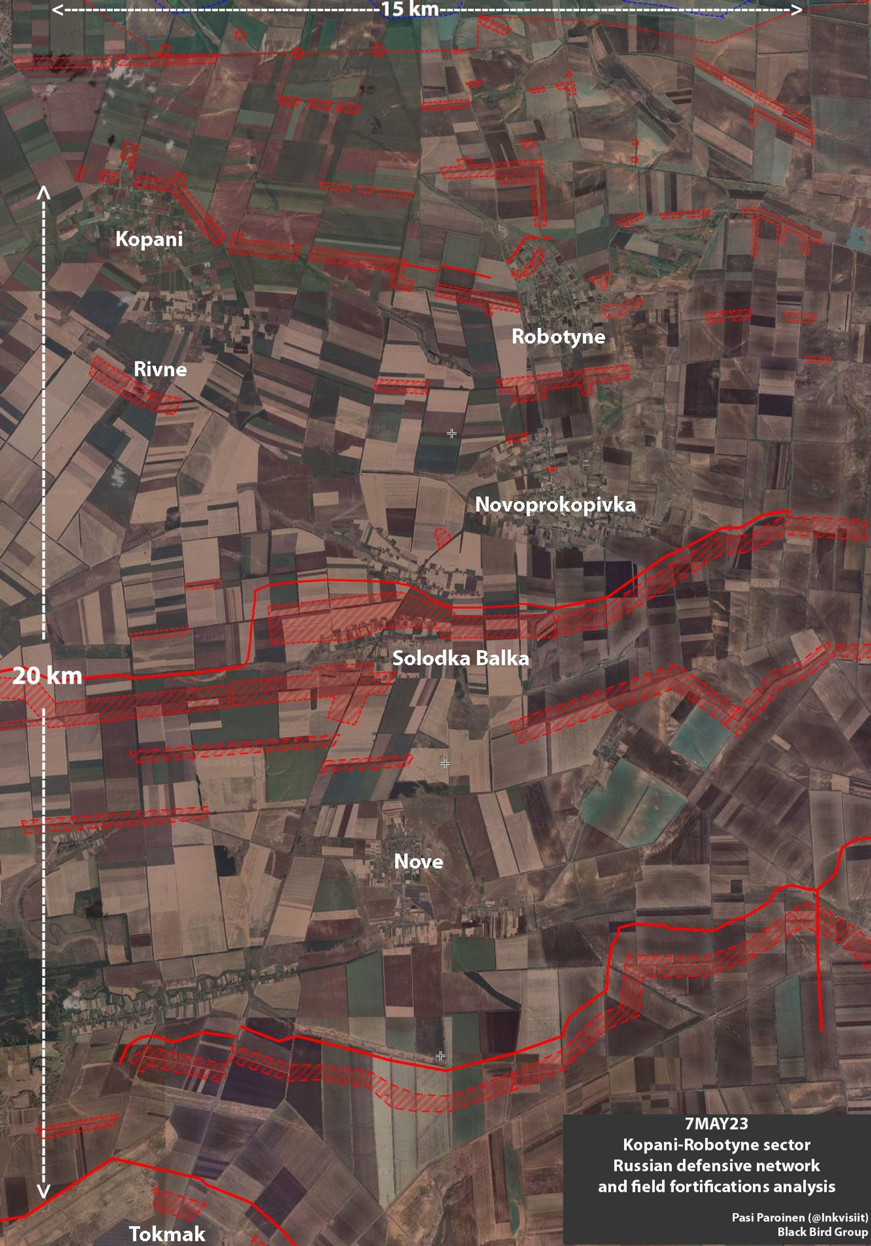 OSINT-аналитик Паси Пароинен опубликовал подробный разбор состояния российских оборонительных линий как раз на Запорожском направлении — на участке Копани — Работино — Токмак. При помощи спутниковым снимков он показал, как организована система фортификационных сооружений и укрепрайонов. Россияне выстроили эшелонированную оборону общей глубиной порядка 30 километров, практически до самого Токмака (сам город подготовлен к круговой обороне). Аналитик Роб Ли отмечает, что цель подобных укреплений — не создать непроницаемую оборону, а не позволить украинским силам перевести тактический прорыв в стратегический и дать россиянам время для переброски подкреплений.