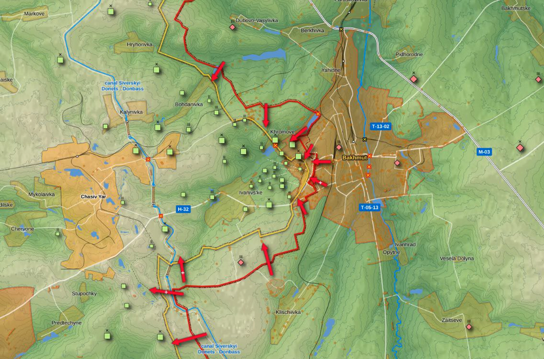 Впрочем, ситуация по крайней мере на южной «дороге жизни» может измениться в лучшую сторону. 8 мая командир украинского подразделения аэроразведки «Терра», которое в настоящее время оказывает поддержку 3 отдельной штурмовой бригаде «Азов» под Бахмутом, сообщил, что украинским силам удалось продвинуться на целый километр. На следующий день Евгений Пригожин в одном из своих видео (расшифровка доступна здесь) сообщил, что 72 [отдельная мотострелковая] бригада ВС РФ «просрала три квадратных километра», бежав с поля боя. В телеграм-канале 3-й штурмовой бригады подтвердили эту информацию, заявив о более 150 убитых россиянах за два дня на юго-западных окраинах Бахмута и опубликовав кадры украинского наступления, снятые с беспилотников и нашлемных камер. В Телеграме также приводится (пока не подтвержденная) карта предполагаемого продвижения украинских сил