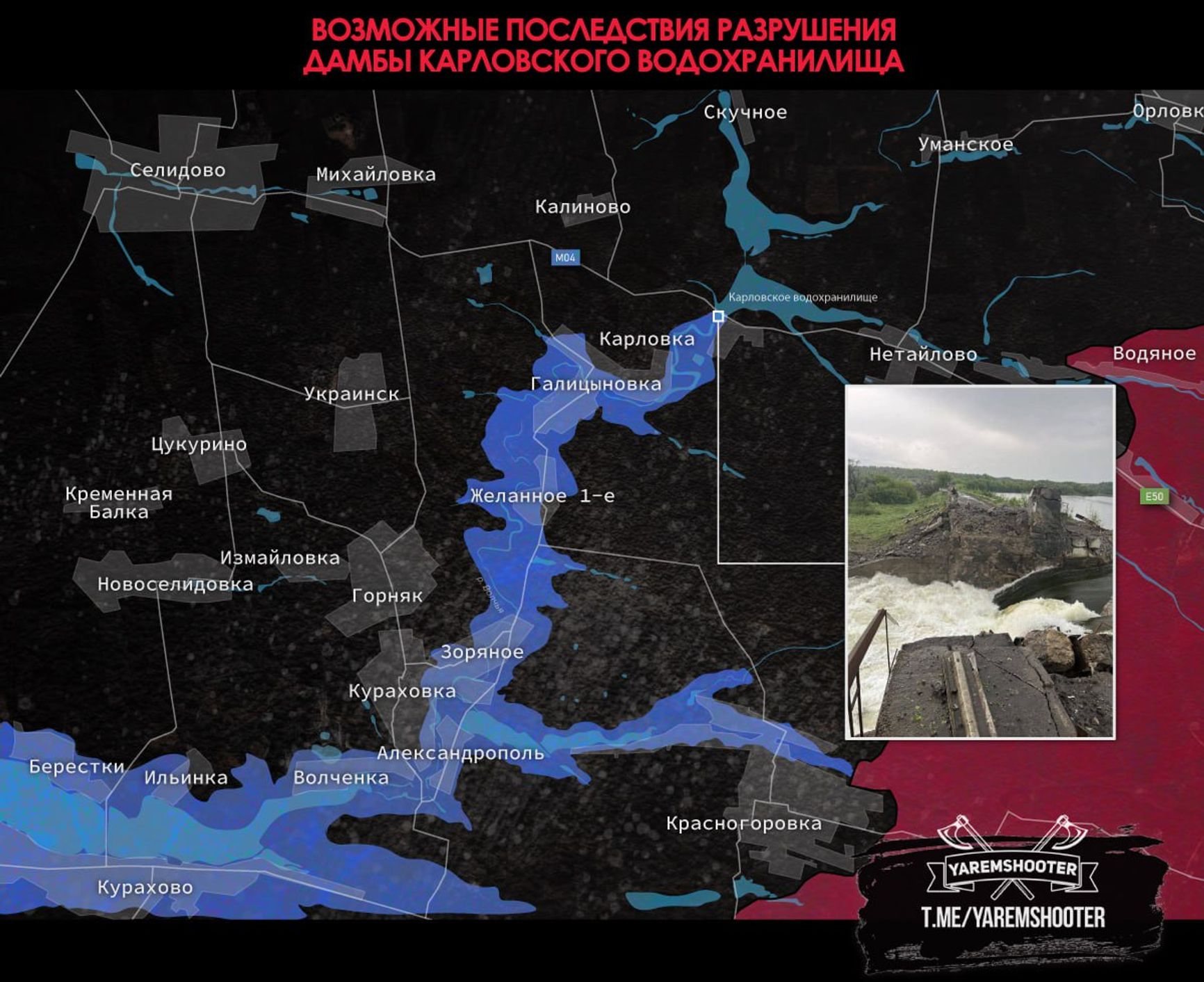 Накануне была поражена дамба Карловского водохранилища на подконтрольной ВСУ территории в предместьях Донецка. В результате под угрозой подтопления оказались населенные пункты Галициновка, Желанное-1 и Желанное-2. Глава Донецкой ОВА Павел Кириленко напомнил, что российская армия регулярно обстреливала Карловку с начала войны. По его словам, если ситуация осложнится, то будет начата эвакуация гражданского населения.