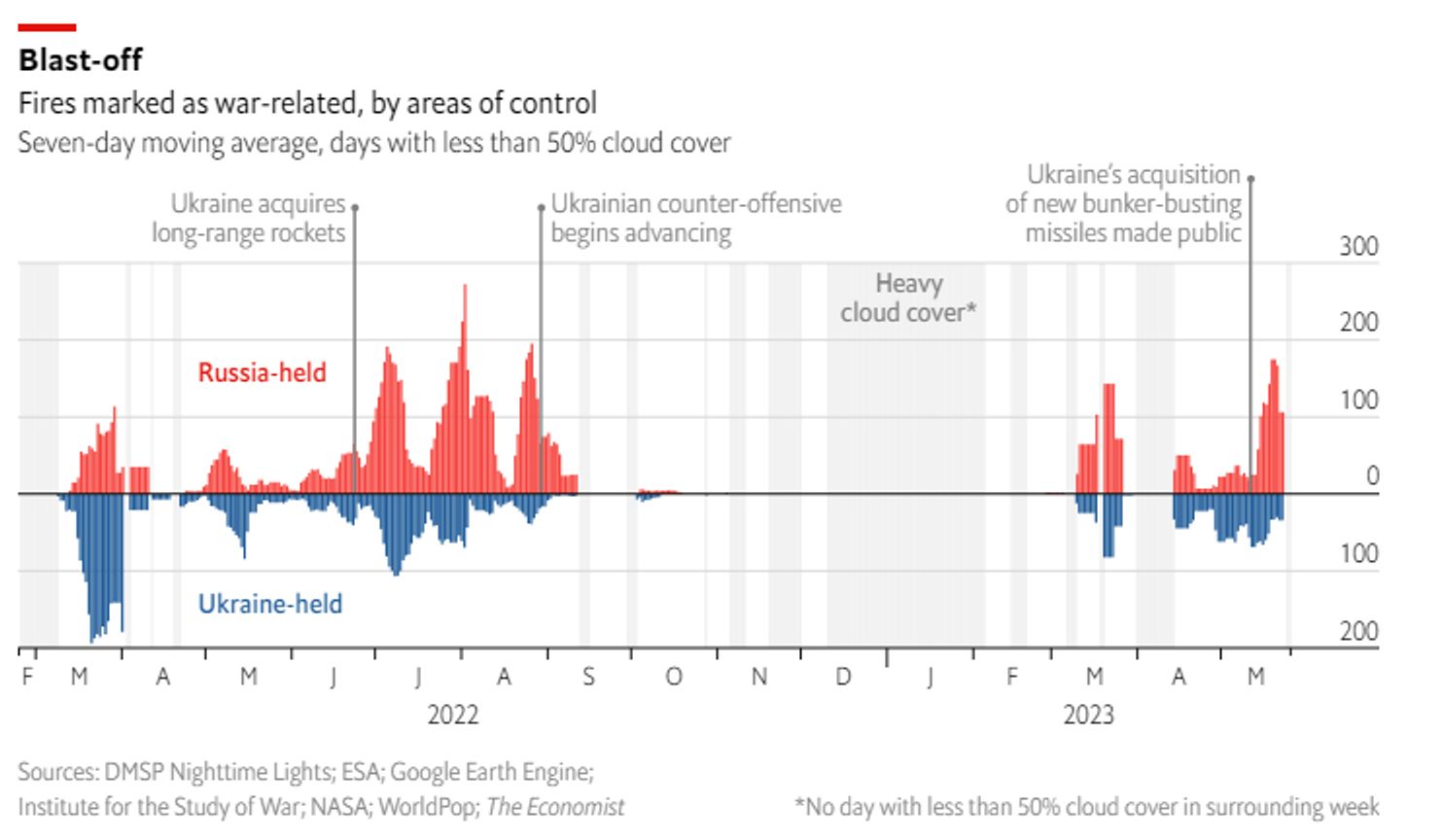 The Economist пишет о фиксации за последние две недели с помощью спутниковых данных 907 пожаров на оккупированной территории Украины. Издание предполагает, что причиной большей их части стали обстрелы этих территорий. Отмечается, что это в два раза больше, чем в предыдущую пару недель. Всплеск количества пожаров, согласно указанной выборке, начался 11 мая, совпав по времени с началом применения Украиной дальнобойных ракет Storm Shadow.