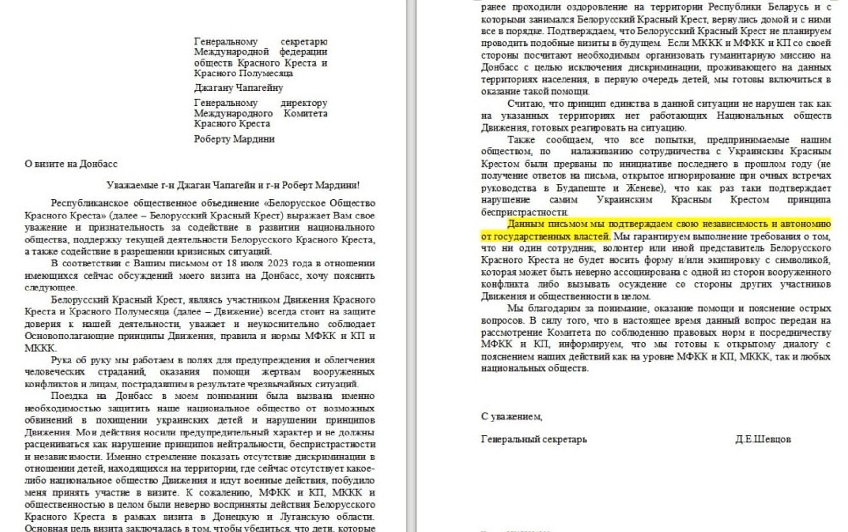 Еще в одном ответе непосредственно Шевцов пишет Международному Красному Кресту, что ездил на Донбасс для того, чтобы опровергнуть обвинения в краже украинских детей. Исходя из письма, Шевцов ездил лично проверить, вернулись ли домой те дети, которые находились в Беларуси «на оздоровлении». Также он отмечает, что белорусский Красный Крест «подтверждает свою независимость и автономию от государственных властей».
