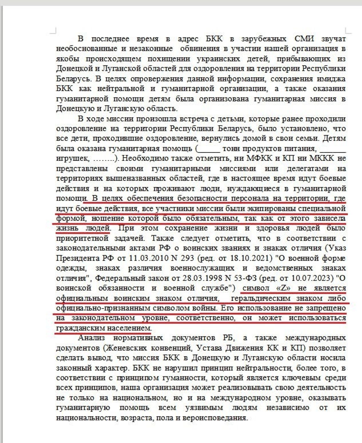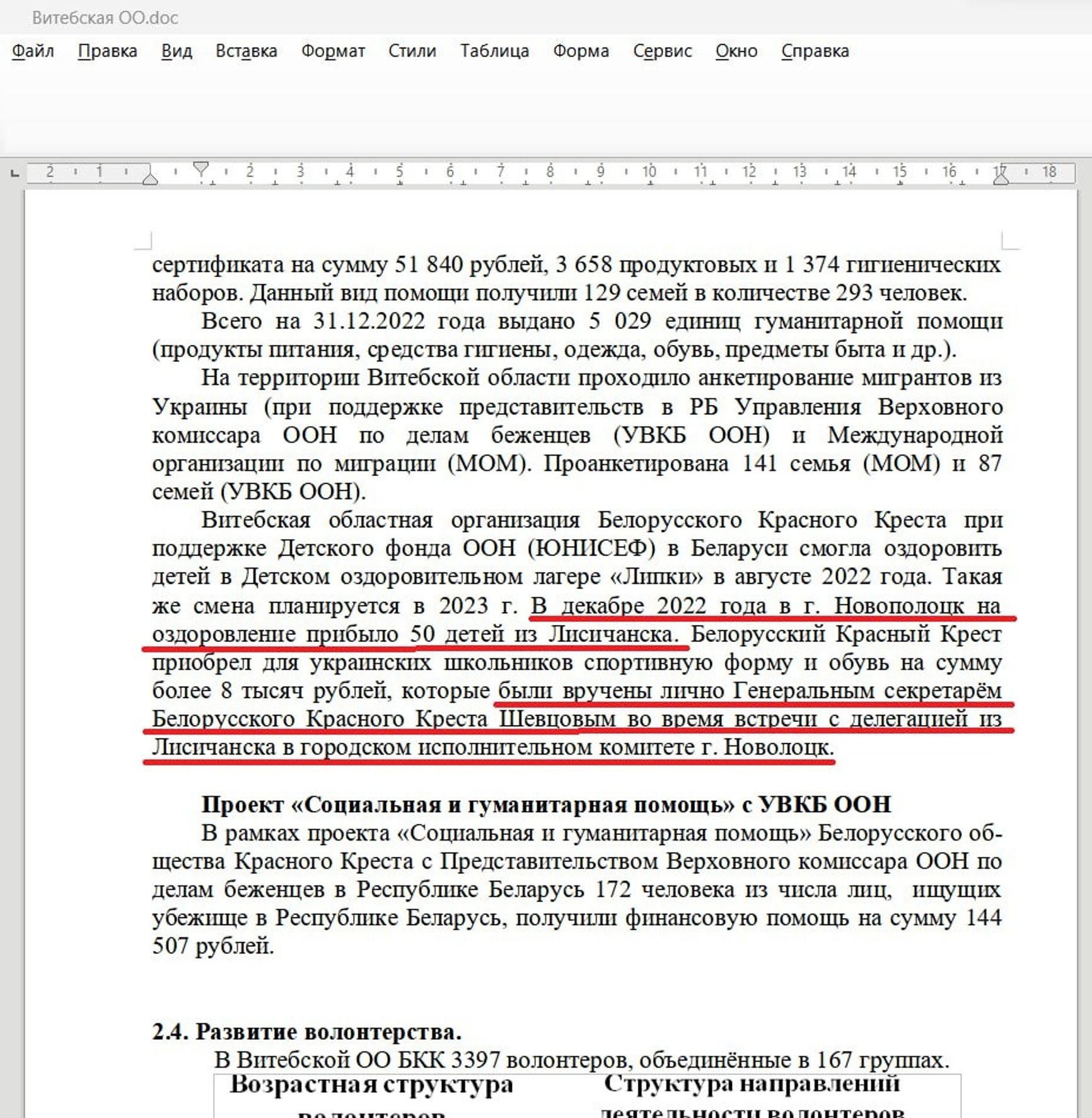 В частности, в отчете Минской областной организации белорусского Красного Креста за 2022 год написано про помощь украинским детям с социализацией и интеграцией в белорусское сообщество. При этом война в Украине в этих документах названа «СВО». В одном из документов сказано, что только в ноябре 2022 года в белорусский город Новополоцк прибыло 50 детей, им купили спортивную одежду и обувь на 8 тысяч белорусских рублей (300 тысяч рублей РФ).