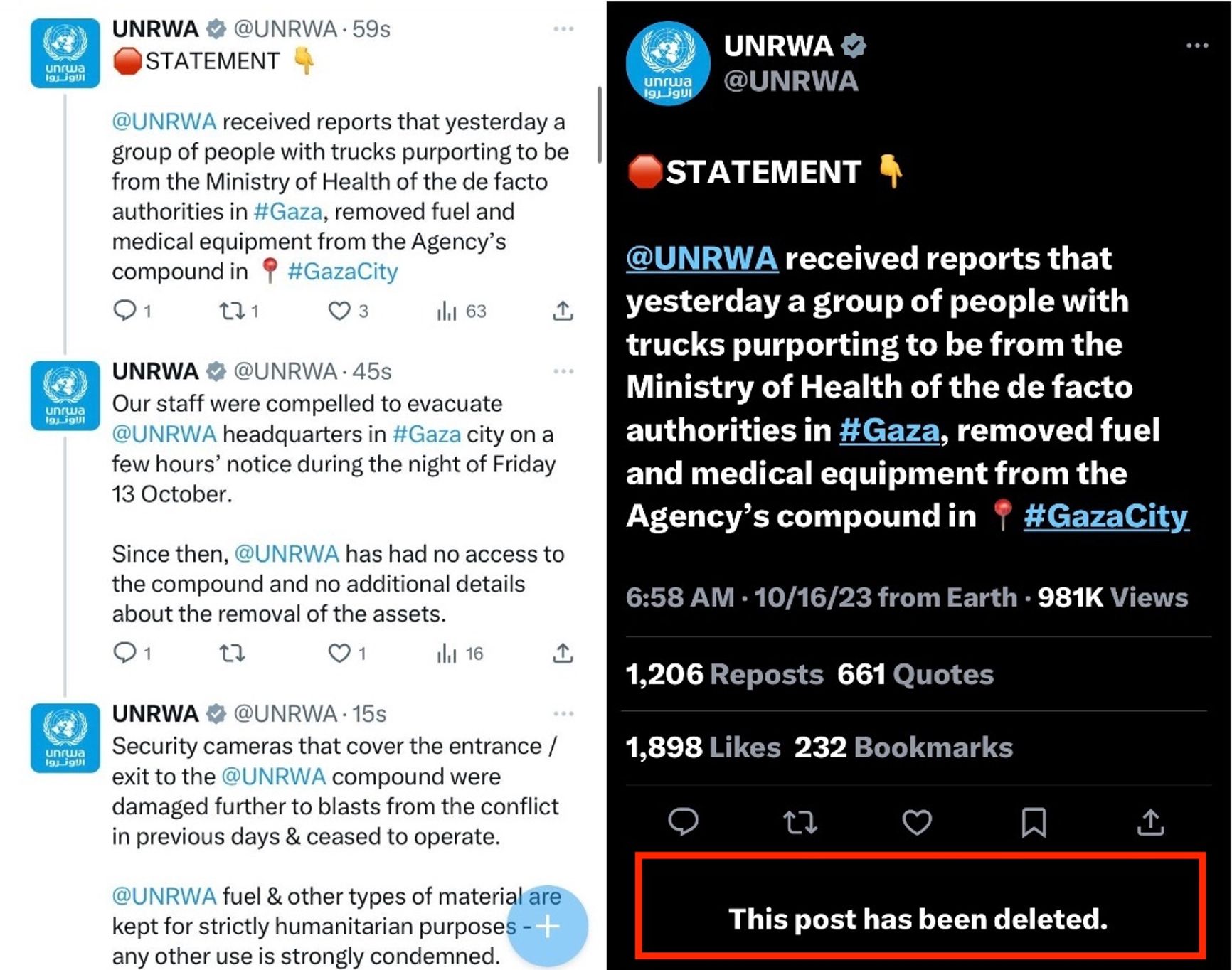 В соцсети X (экс-Twitter) Ближневосточное агентство ООН для помощи палестинским беженцам и организации работы (БАПОР) опубликовало сообщения о том, что боевики ХАМАС 15 октября похитили лекарства и топливо, предназначенные для мирных жителей, со складов БАПОР в секторе Газа. В сообщениях агентства говорилось: «Люди в грузовиках [с опознавательными признаками] местного Министерства здравоохранения, контролируемого ХАМАС, загрузили грузовики медикаментами и топливом». Также в сообщениях БАПОР утверждалось, что сотрудники агентства эвакуировались оттуда до ограбления — в пятницу, 13 октября.