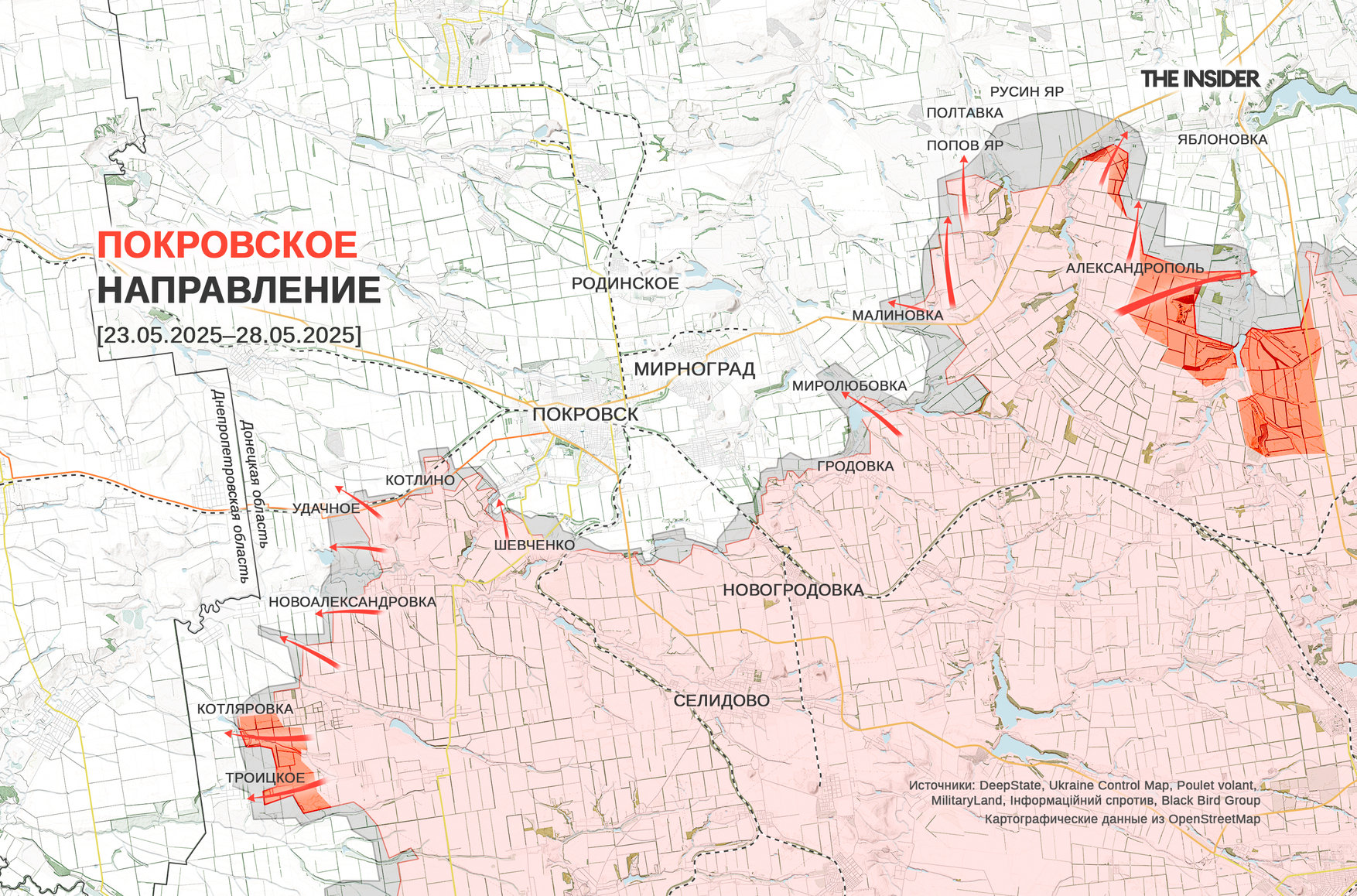 По информации DeepState, российские войска продвинулись около Троицкого на западном фланге и в сторону Яблоновки и в Малиновке (до 2016 года — Ульяновка) на восточном фланге, расширяя фланговый охват Мирнограда.