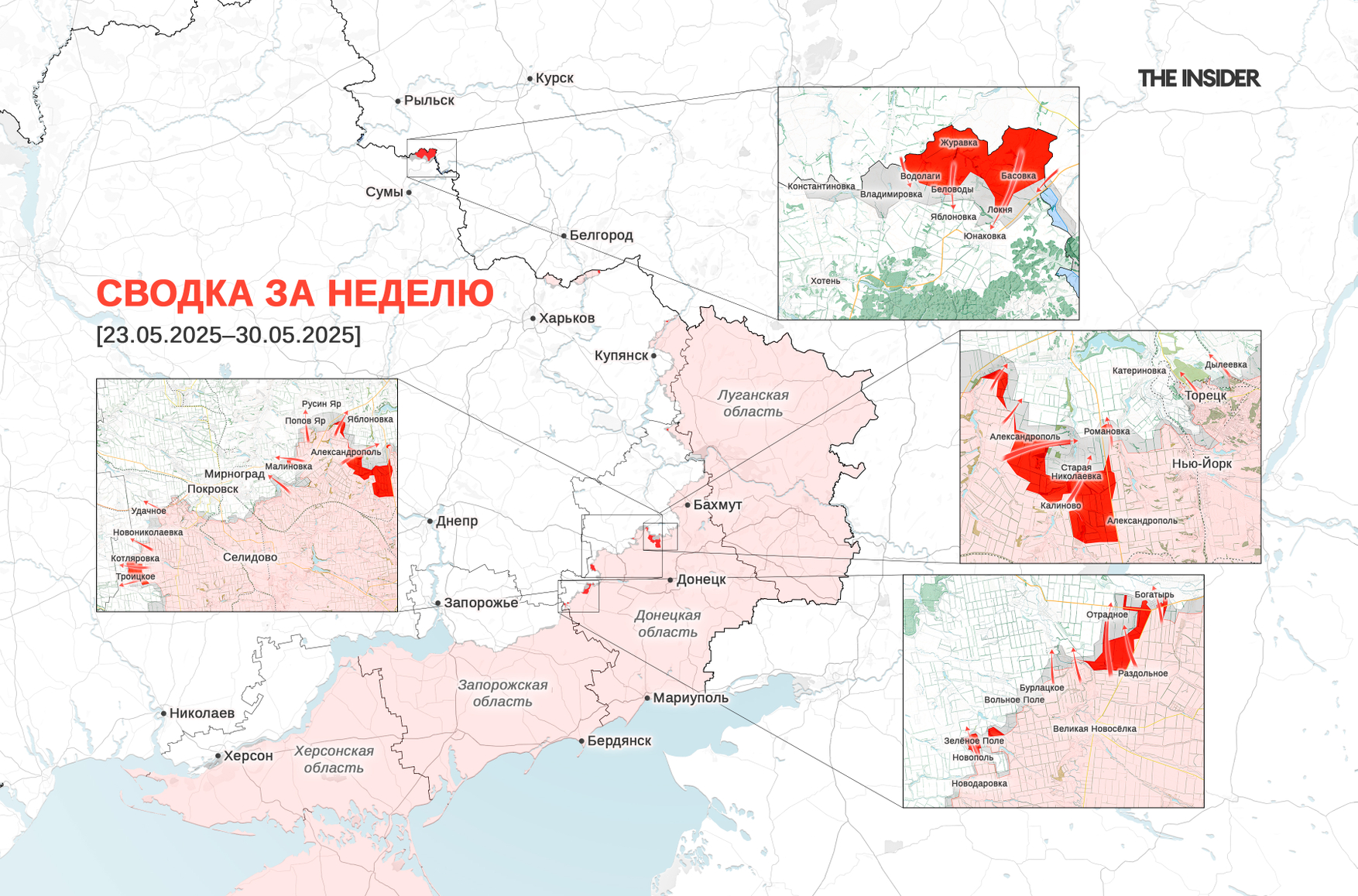 Украинский OSINT-ресурс «Око Гора ✙ Новости и аналитика» публикует карту изменений территориального контроля на украинском ТВД с 19 по 25 мая. Согласно этой информации, в этот период ВС РФ заняли 188 кв. км, то есть продвигались темпом примерно 27 кв. км в день — по оценке DeepState, это самое быстрое продвижение ВС РФ с начала 2025 года. В издании «Агентство» связывают это с усилением российских штурмовых действий на нескольких направлениях и отложенным эффектом длительных наступательных операций.