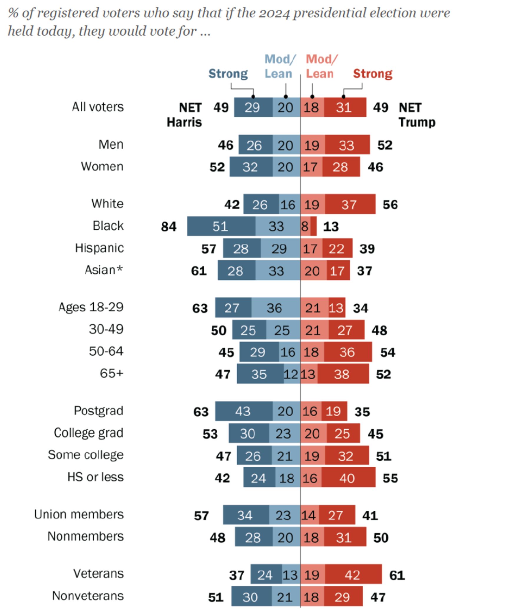 Если же совместить факторы возраста и гендера, то дистанция становится разительной: Харрис поддерживают 67% молодых женщин, а если это студентки, то и вовсе более 80%. Кстати, образование само по себе — один из важных предикторов на этих выборах.