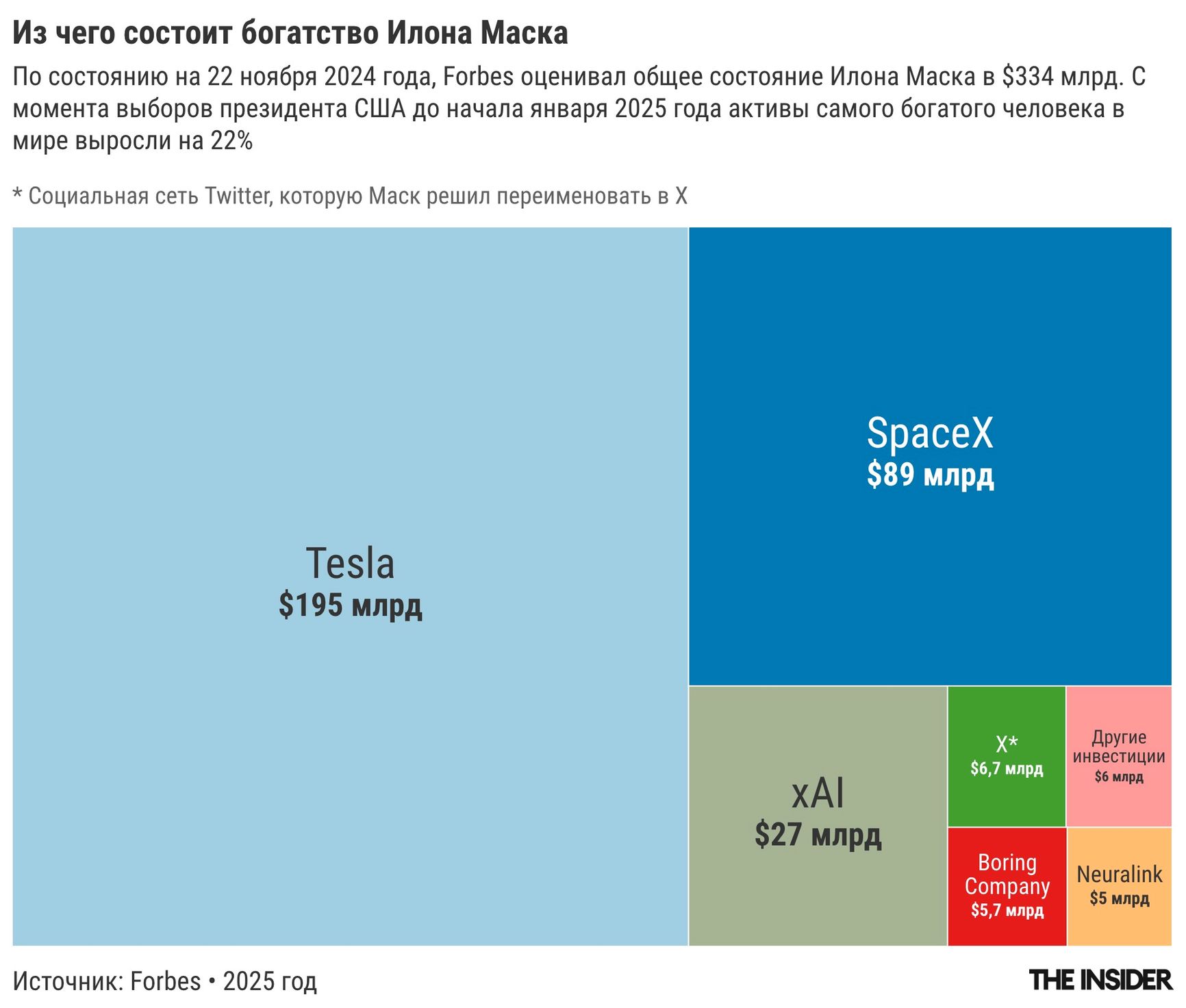 Поддерживая Трампа, бизнесмен явно не в последнюю очередь думал и о госконтрактах, на которых заработал часть своих капиталов. Forbes называет Маска самым богатым человеком в мире, оценивая его состояние в $406,7 млрд (по состоянию на 6 февраля 2025 года). Основные компании, в управление которыми сегодня вовлечен Илон Маск, — это SpaceX (запуск космических кораблей и спутников Starlink), Tesla (электроавтомобили и автономные машины) и соцсеть Twitter, которую Маск решил переименовать в X. SpaceX — единственная компания, которую он основал самостоятельно, и возможно, наиболее успешная, но насколько успешная, оценить трудно, поскольку непубличные компании не обязаны публиковать отчетность.