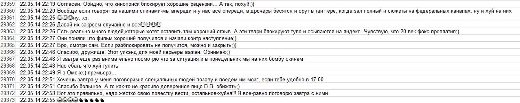 Галустян, тем временем тоже не дремлет, и информирует Прокопенко о другом сообщении, насчет блокировок рецензий на КиноПоиске: